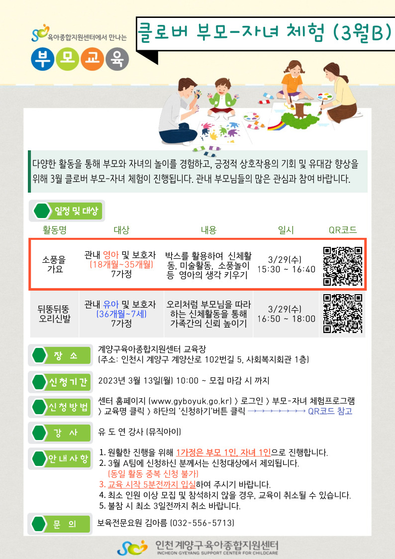 | 기타사항 | * 상기 일정은 센터 사정에 의해 변경될 수 있습니다. * 꼭 자녀를 1명만 등록하여 주시기 바랍니다. |