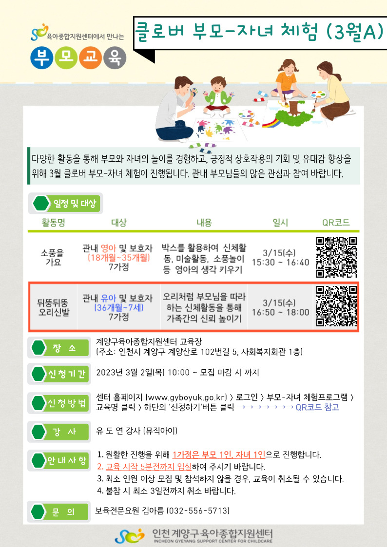 | 기타사항 | * 상기 일정은 센터 사정에 의해 변경될 수 있습니다. * 자녀를 꼭 1명만 등록하여 주시기 바랍니다. |