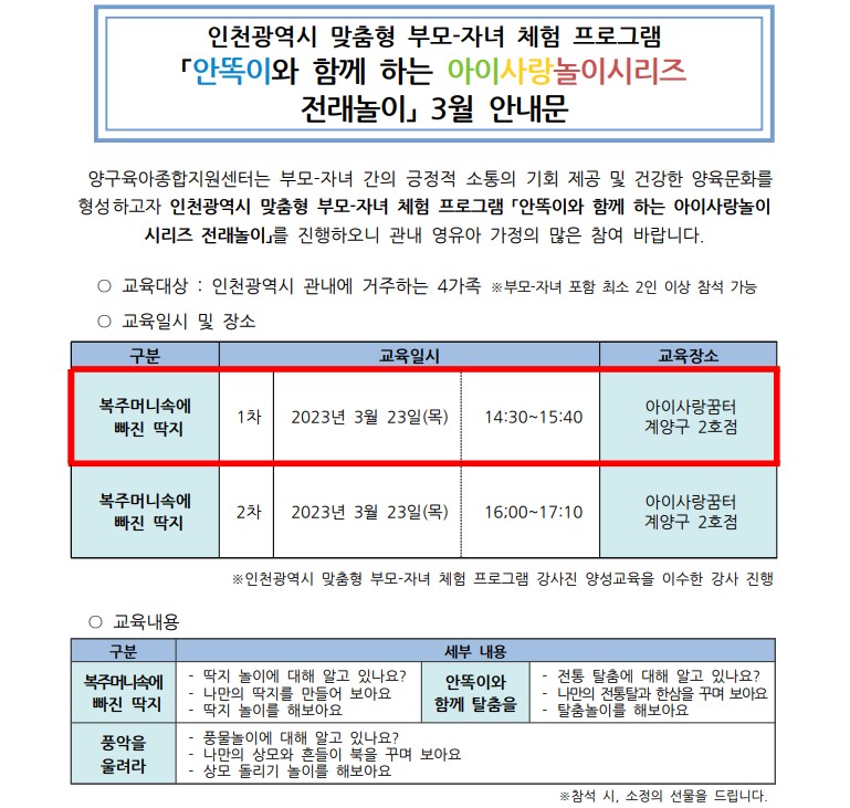 인천광역시 맞춤형 부모-자녀 체험 안똑이와 함께 하는 아이사랑놀이시리즈 전래놀이(딱지)