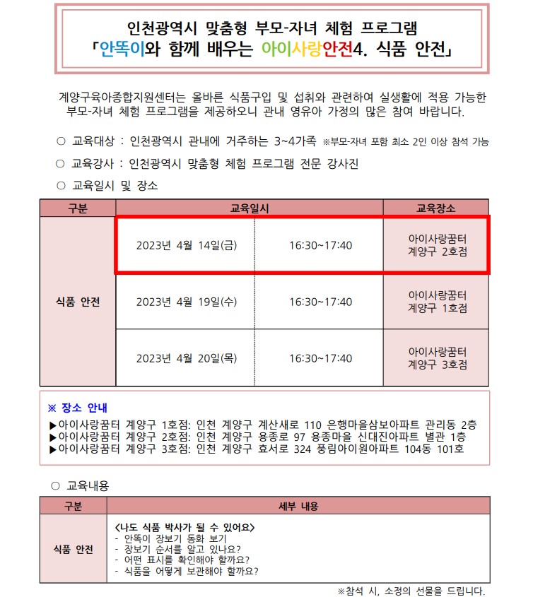 인천광역시 맞춤형 부모-자녀 체험 안똑이와 함께 배우는 아이사랑안전4. 식품안전