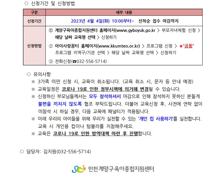 4월 14일(금) 오후 4시 30분 <아이사랑꿈터 계양구 2호점>에서 진행