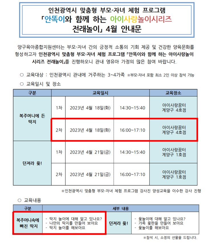 인천광역시 맞춤형 부모-자녀 체험 안똑이와 함께 하는 아이사랑놀이시리즈 전래놀이(딱지)