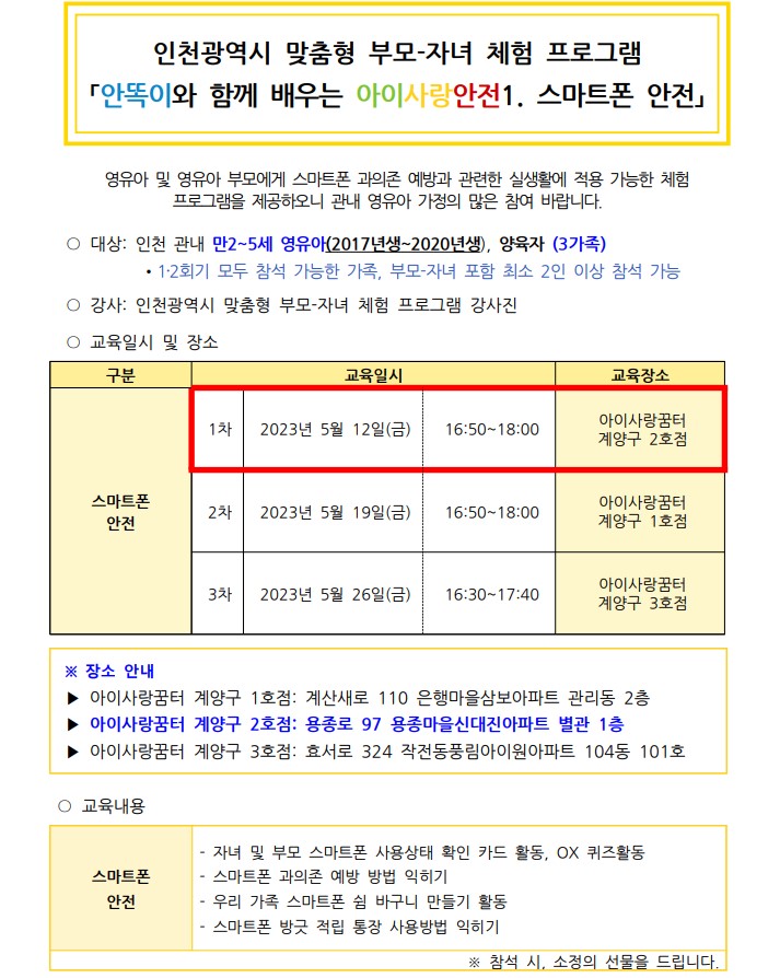 인천광역시 맞춤형 부모-자녀 체험 안똑이와 함께 배우는 아이사랑안전1. 스마트폰 안전