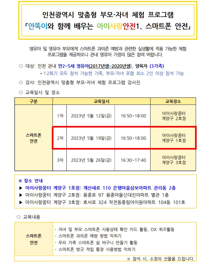 인천광역시 맞춤형 부모-자녀 체험 안똑이와 함께 배우는 아이사랑안전1. 스마트폰 안전