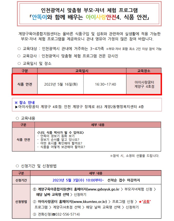 인천광역시 맞춤형 부모-자녀 체험 안똑이와 함께 배우는 아이사랑안전4. 식품안전