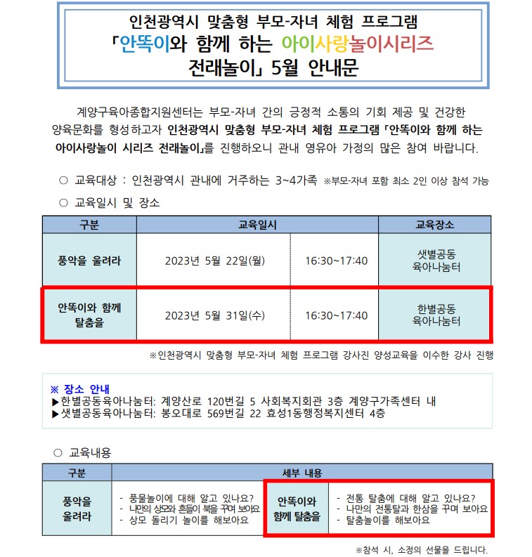 인천광역시 맞춤형 부모-자녀 체험 안똑이와 함께 하는 아이사랑놀이시리즈 전래놀이(탈춤)