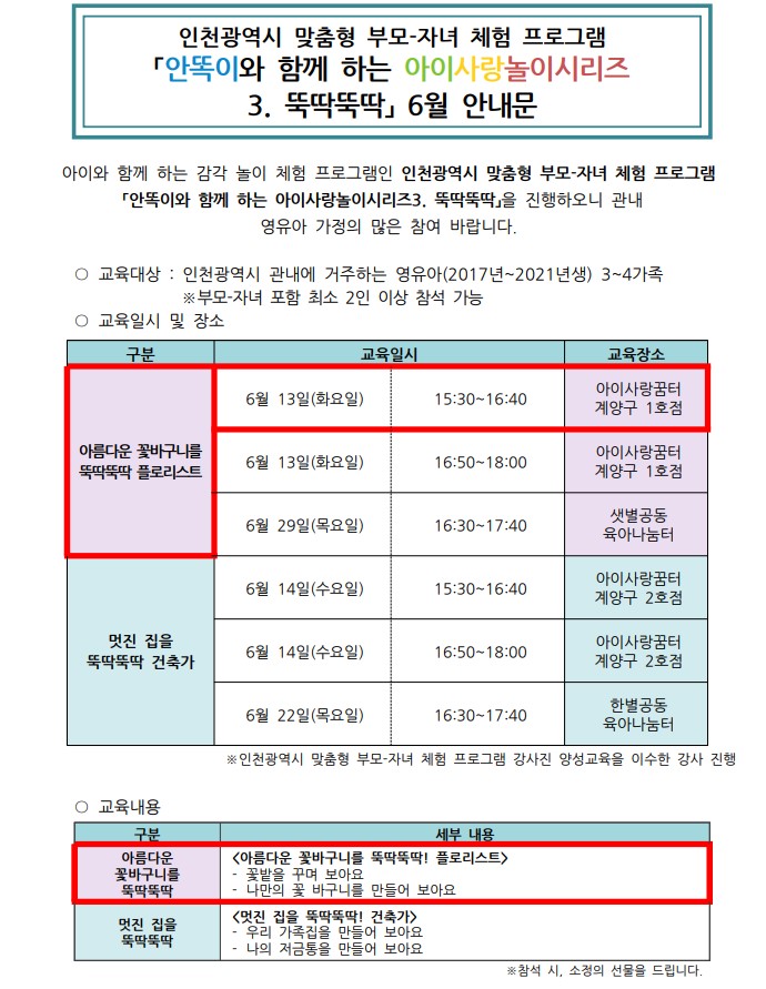 6/13(화) 오후 3시 30분~4시 40분, 아이사랑꿈터 계양구 1호점에서 진행