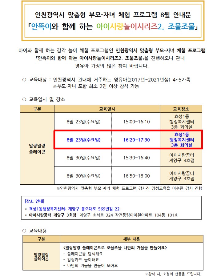 인천광역시 맞춤형 부모-자녀 체험 안똑이와 함께 하는 아이사랑놀이시리즈2. 조물조물-플레이콘