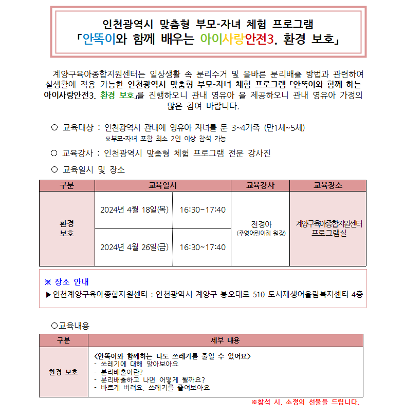| 기타사항 | 4월 18일(목) 16:30~17:40 / 계양구육아종합지원센터4층 프로그램실 진행 | ||