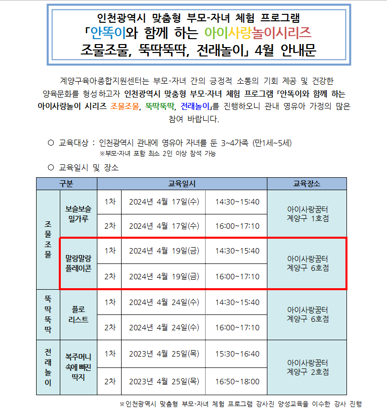 | 기타사항 | 4월 19일(금) 14:30~15:40 / 아이사랑꿈터 계양구 6호점 진행 | ||