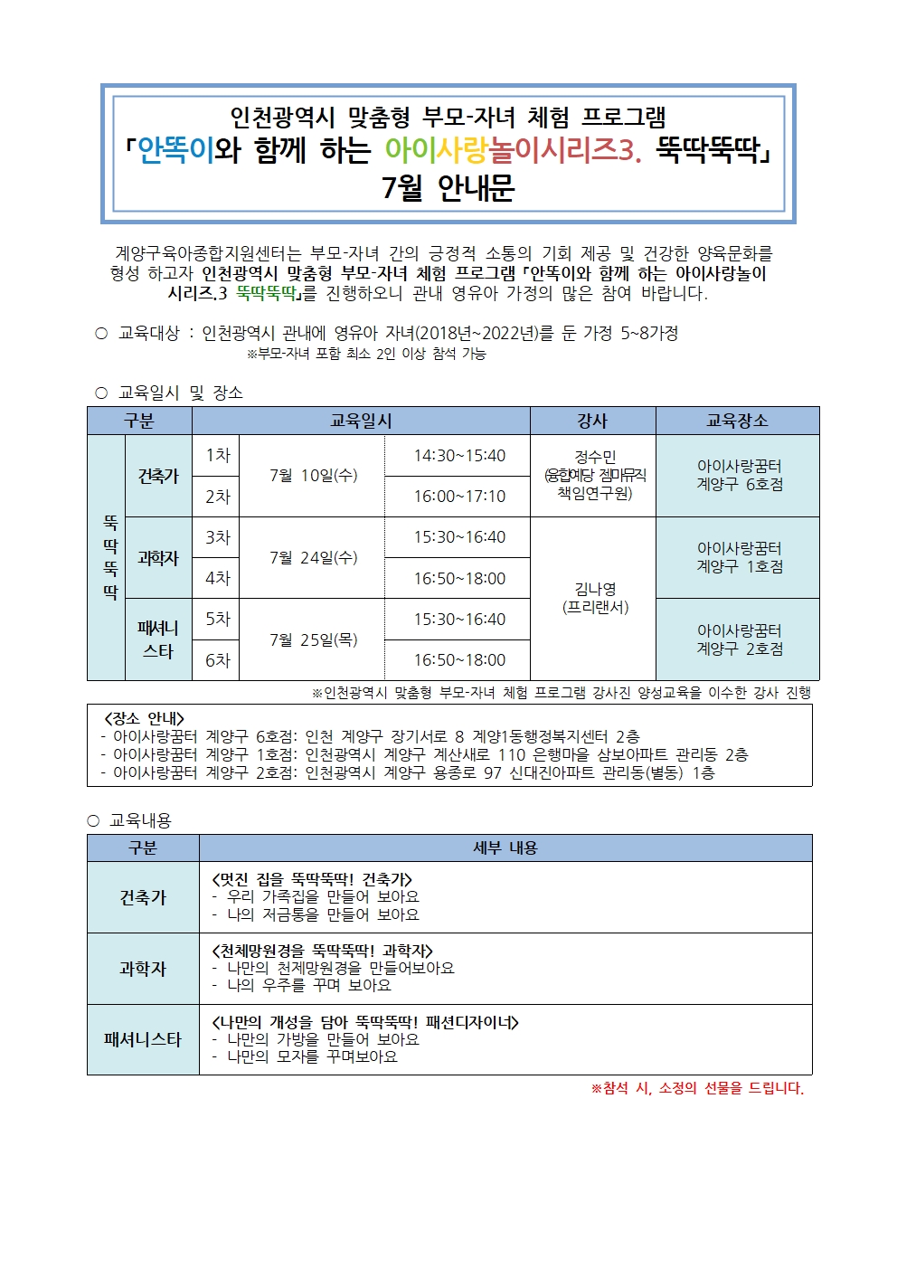 [인천형 부모-자녀체험] 안똑이 놀이시리즈-뚝딱뚝딱(패션디자이너)