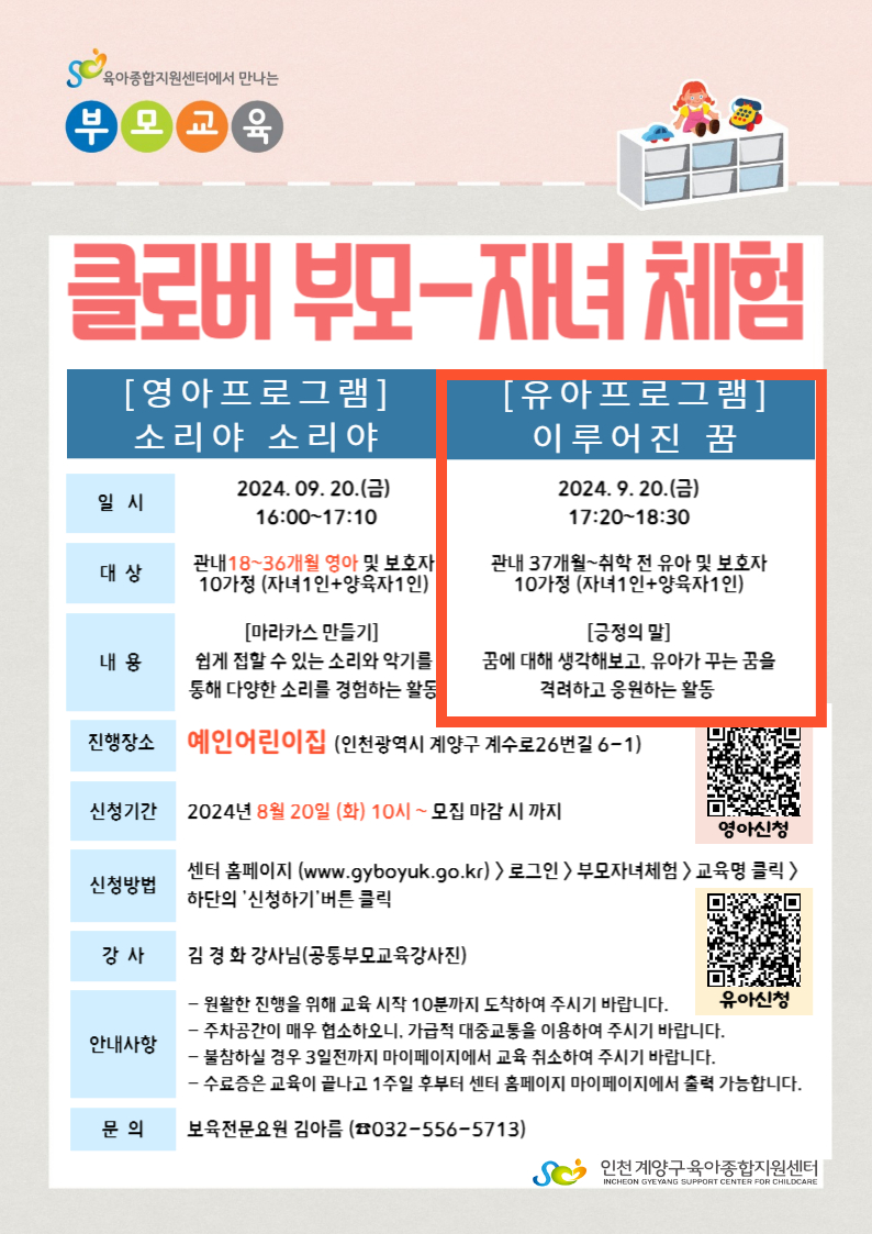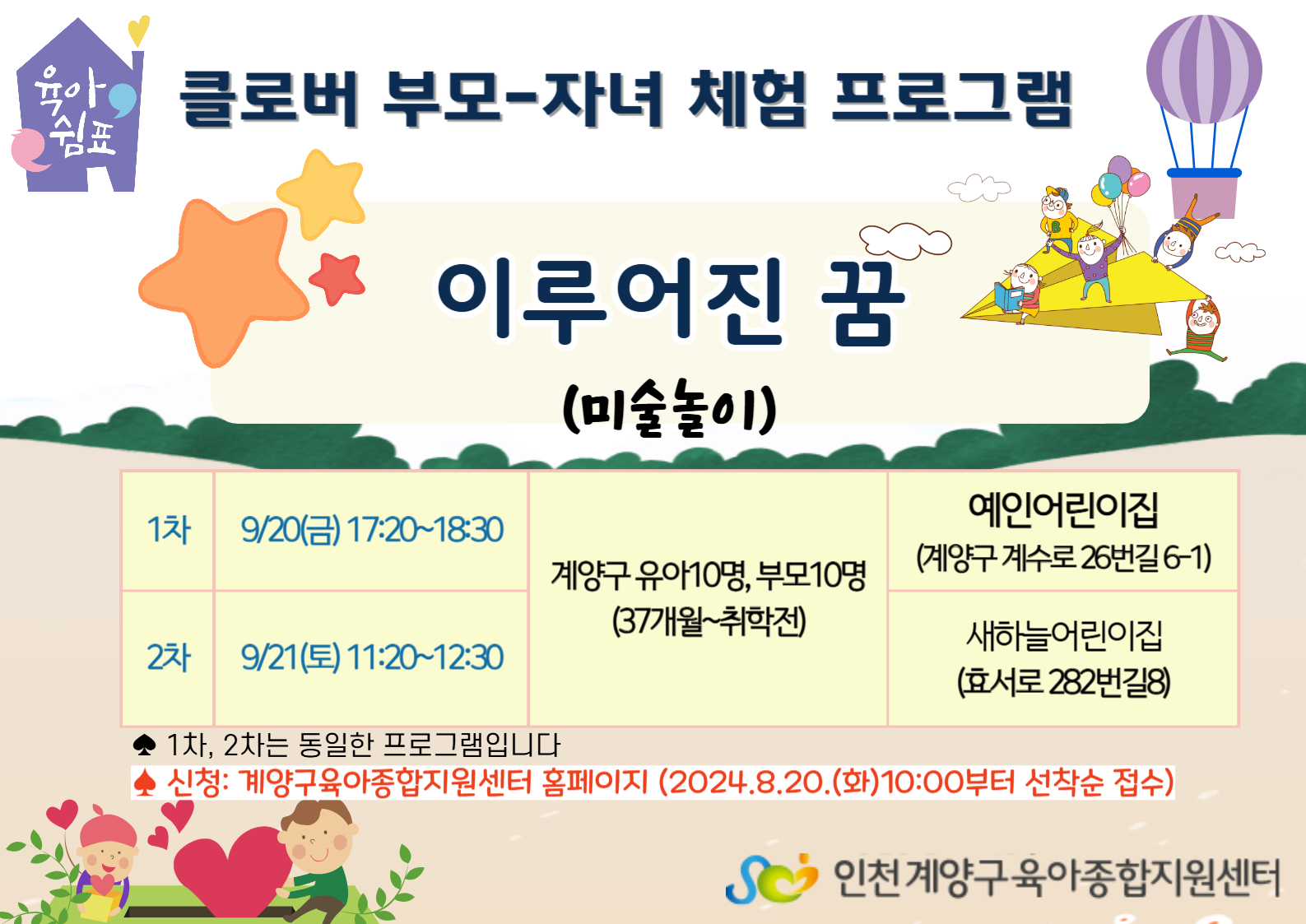 | 기타사항 | (육아쉼표) 유아체험 _이루어진 꿈 (9.20.(금)17:20~18:30) | ||