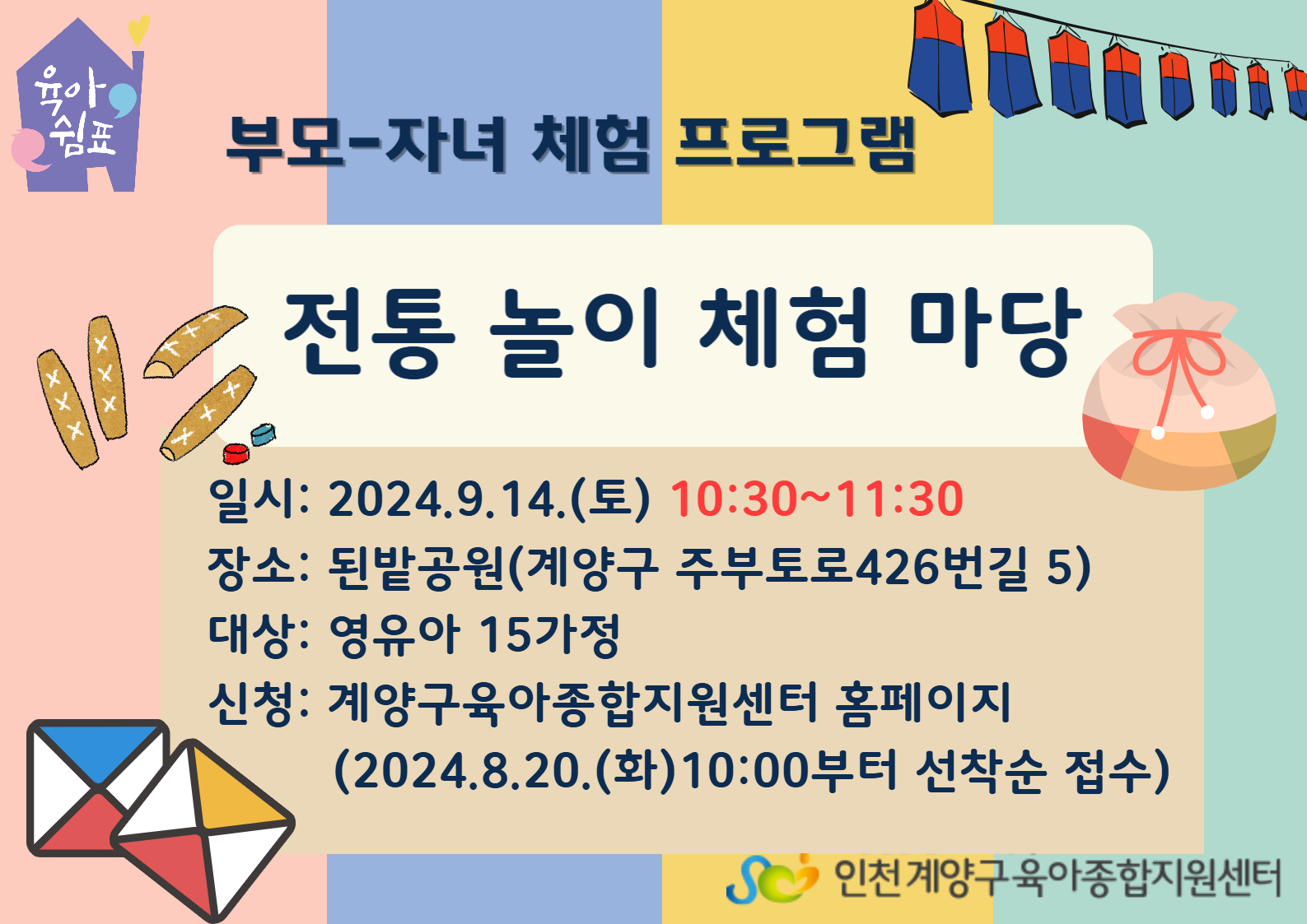 | 기타사항 | (육아쉼표) 전통 놀이 체험 마당 (9.14.(토)10:30~11:30 된밭공원(주부토로426번길 5)) | ||
