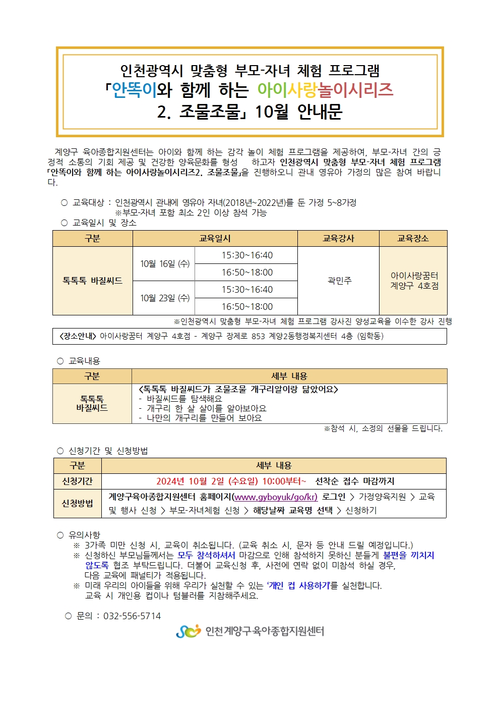 [인천형 부모-자녀체험] 안똑이 놀이시리즈-조물조물(바질씨드)