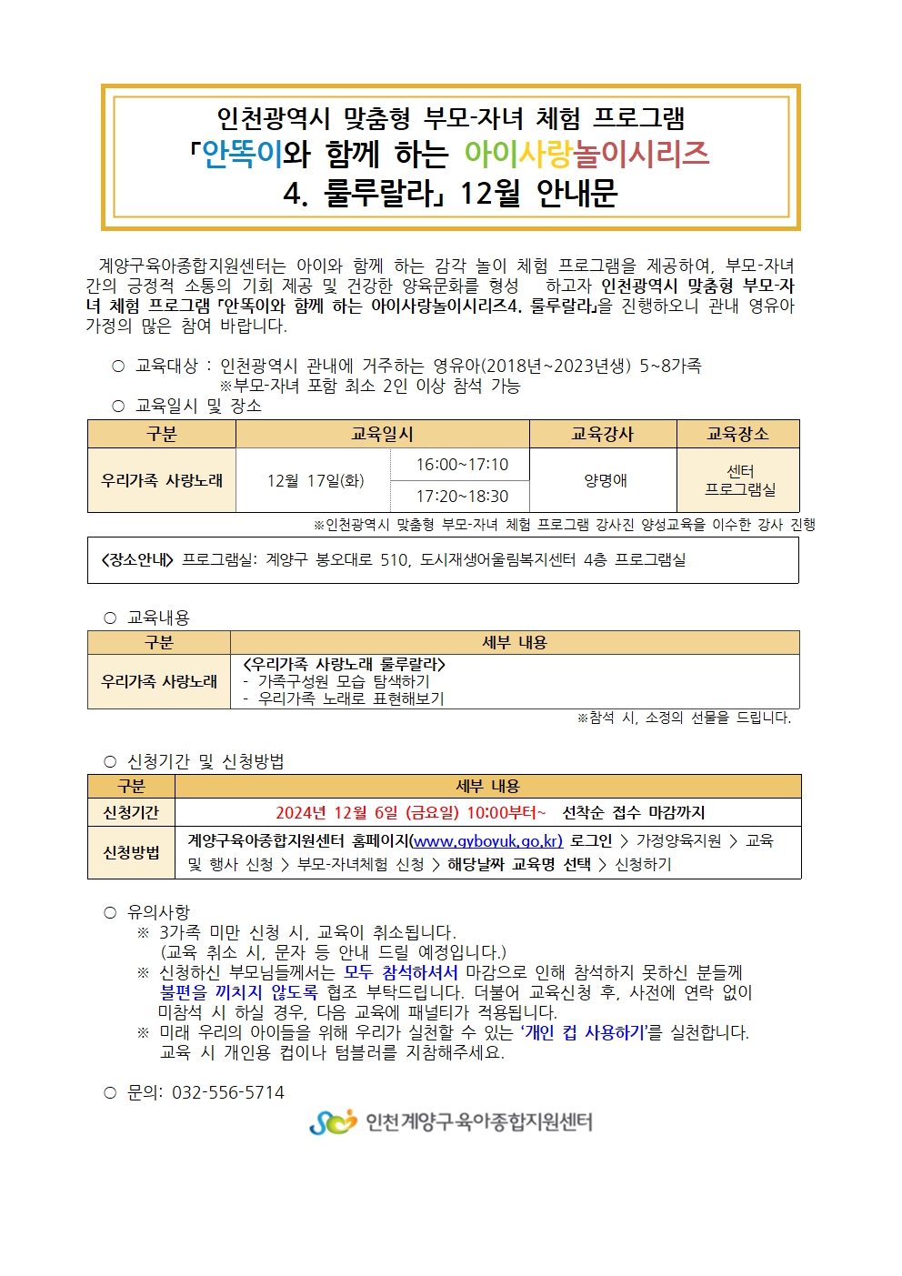 [인천형 부모-자녀체험] 안똑이 놀이시리즈-룰루랄라(우리가족 사랑노래)