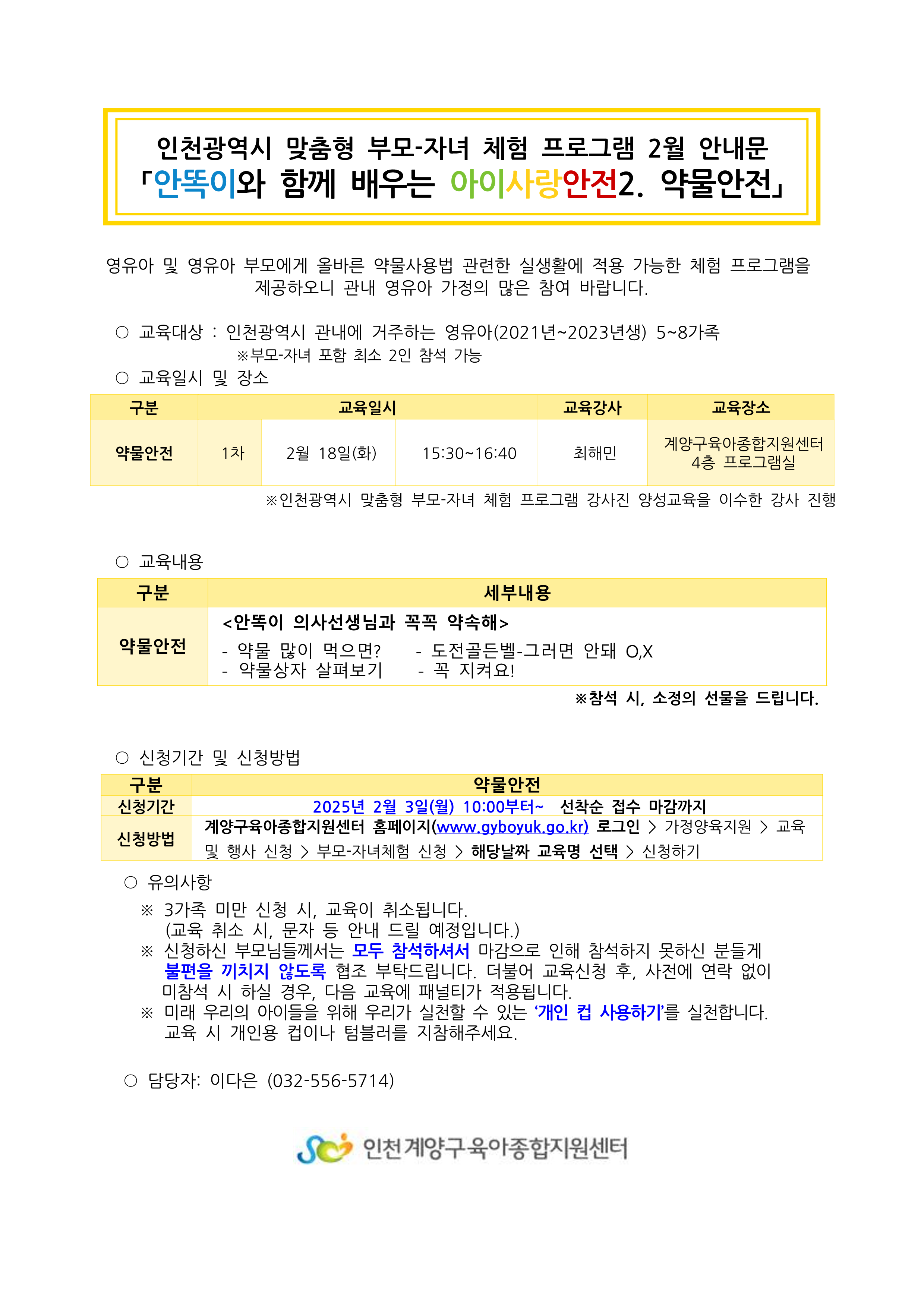 | 기타사항 | ※ 3가족 미만 신청 시, 교육이 취소됩니다. (교육 취소 시, 전화 등 안내 드릴 예정입니다.) ※ 신청하신 부모님들께서는 모두 참석하셔서 마감으로 인해 참석하지 못하신 분들께 불편을 끼치지 않도록 협조 부탁드립니다. ※ 부득이한 사정으로 취소 시 전화연락 바랍니다(032-556-5714) ※ 해당 연령대에 맞지 않을 경우, 신청이 취소될 수 있음을 양해 부탁드립니다. |