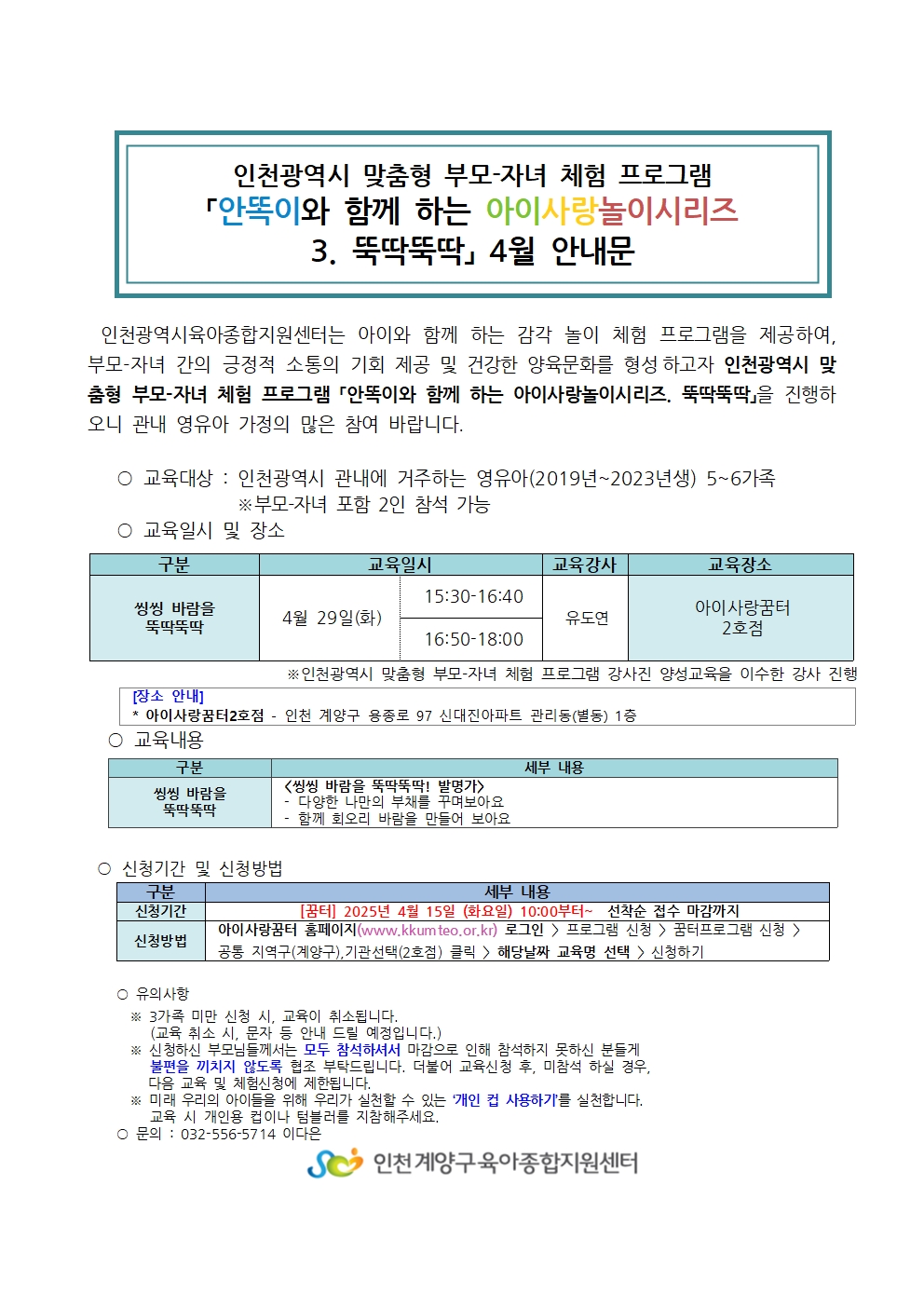 | 기타사항 | **참여 안내 및 유의사항** ※3가족 미만 신청 시 교육이 취소될 수 있습니다. (취소 시 전화 혹은 문자로 안내드리겠습니다.) ※신청하신 부모님들께서는 모두 참석해 주시기 바랍니다. 3회이상 미참여시 다음 체험 및 교육신청에 제한됩니다. ※부득이한 사정으로 취소 시, 반드시 전화로 연락해 주세요 (032-556-5714). ※해당 연령대에 맞지 않는 신청은 취소될 수 있습니다. 양해 부탁드립니다. ※체험 당일 참석 여부 확인 전화를 받지 않으실 경우, 대기자로 순번이 넘어갈 수 있습니다. ※동일 강의에 대해서는 1회만 신청 가능하며, 중복 신청 시 취소됩니다. |