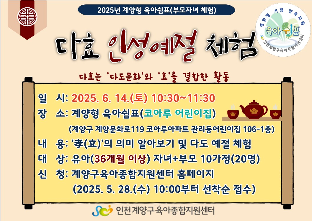 | 기타사항 | 계양형 육아쉼표 교육으로 지역의 거점어린이집에서 진행됩니다. 교육 장소는 구립 코아루어린이집 입니다 (계양구 계양문화로 119 코아루아파트 관리동어린이집 106-1층) |