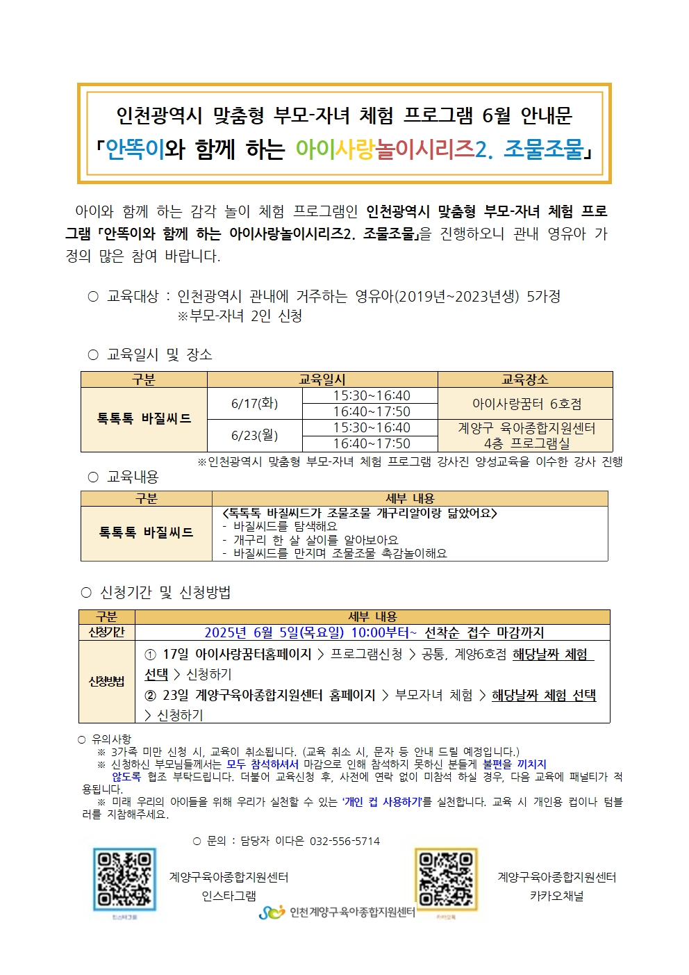 | 기타사항 | **참여 안내 및 유의사항** ※꿈터홈페이지에서만 신청을 받고있습니다. 참고해주세요. ※3가족 미만 신청 시 교육이 취소될 수 있습니다. (취소 시 전화 혹은 문자로 안내드리겠습니다.) ※신청하신 부모님들께서는 모두 참석해 주시기 바랍니다. 3회이상 미참여시 다음 체험 및 교육신청에 제한됩니다. ※부득이한 사정으로 취소 시, 반드시 전화로 연락해 주세요 (032-556-5714). ※해당 연령대에 맞지 않는 신청은 취소될 수 있습니다. 양해 부탁드립니다. ※체험 당일 참석 여부 확인 전화를 받지 않으실 경우, 대기자로 순번이 넘어갈 수 있습니다. ※동일 강의에 대해서는 1회만 신청 가능하며, 중복 신청 시 취소됩니다. |