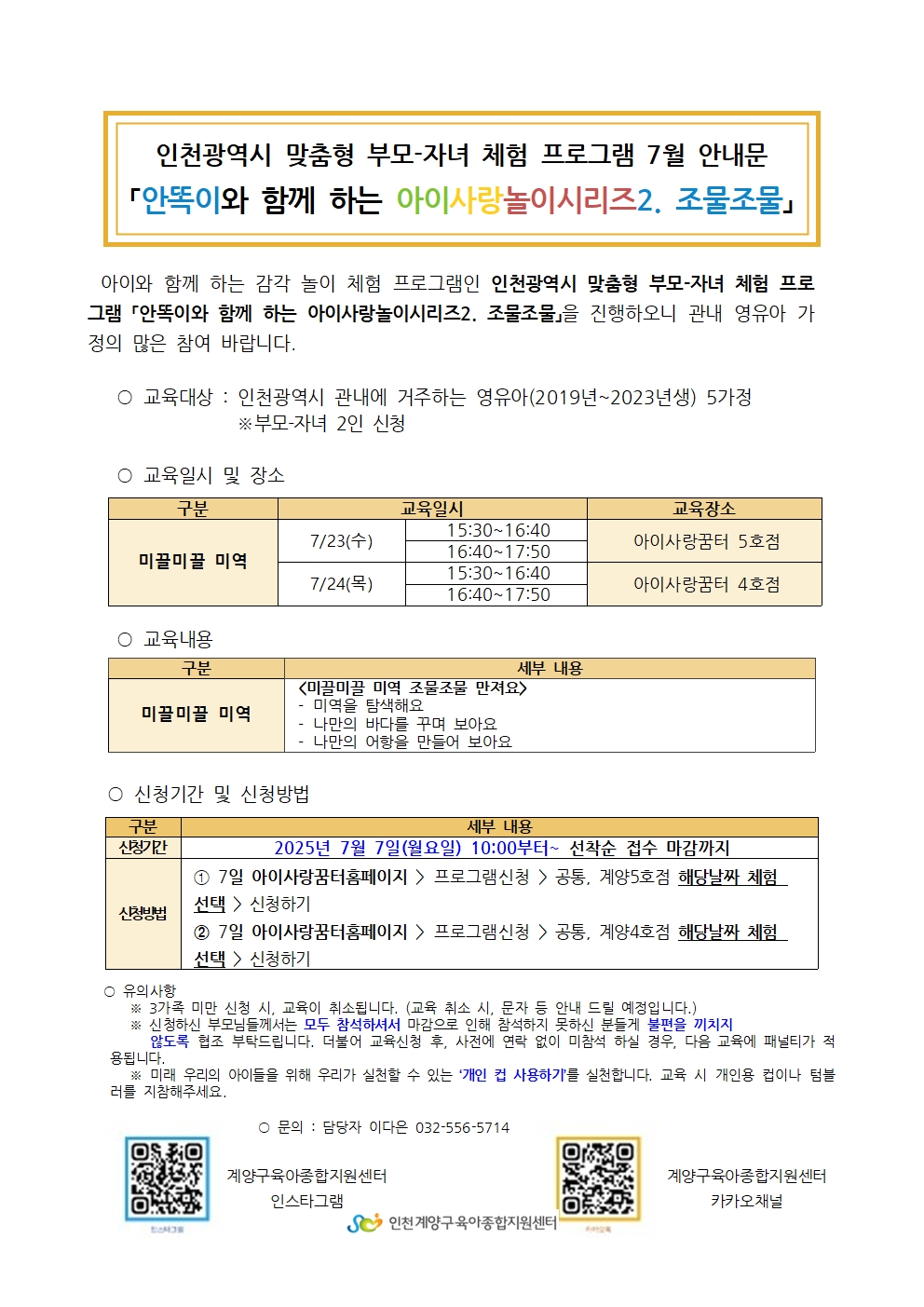 | 기타사항 | **참여 안내 및 유의사항** ※꿈터홈페이지에서만 신청을 받고있습니다. 참고해주세요. ※3가족 미만 신청 시 교육이 취소될 수 있습니다. (취소 시 전화 혹은 문자로 안내드리겠습니다.) ※신청하신 부모님들께서는 모두 참석해 주시기 바랍니다. 3회이상 미참여시 다음 체험 및 교육신청에 제한됩니다. ※부득이한 사정으로 취소 시, 반드시 전화로 연락해 주세요 (032-556-5714). ※해당 연령대에 맞지 않는 신청은 취소될 수 있습니다. 양해 부탁드립니다. ※체험 당일 참석 여부 확인 전화를 받지 않으실 경우, 대기자로 순번이 넘어갈 수 있습니다. ※동일 강의에 대해서는 1회만 신청 가능하며, 중복 신청 시 취소됩니다. |