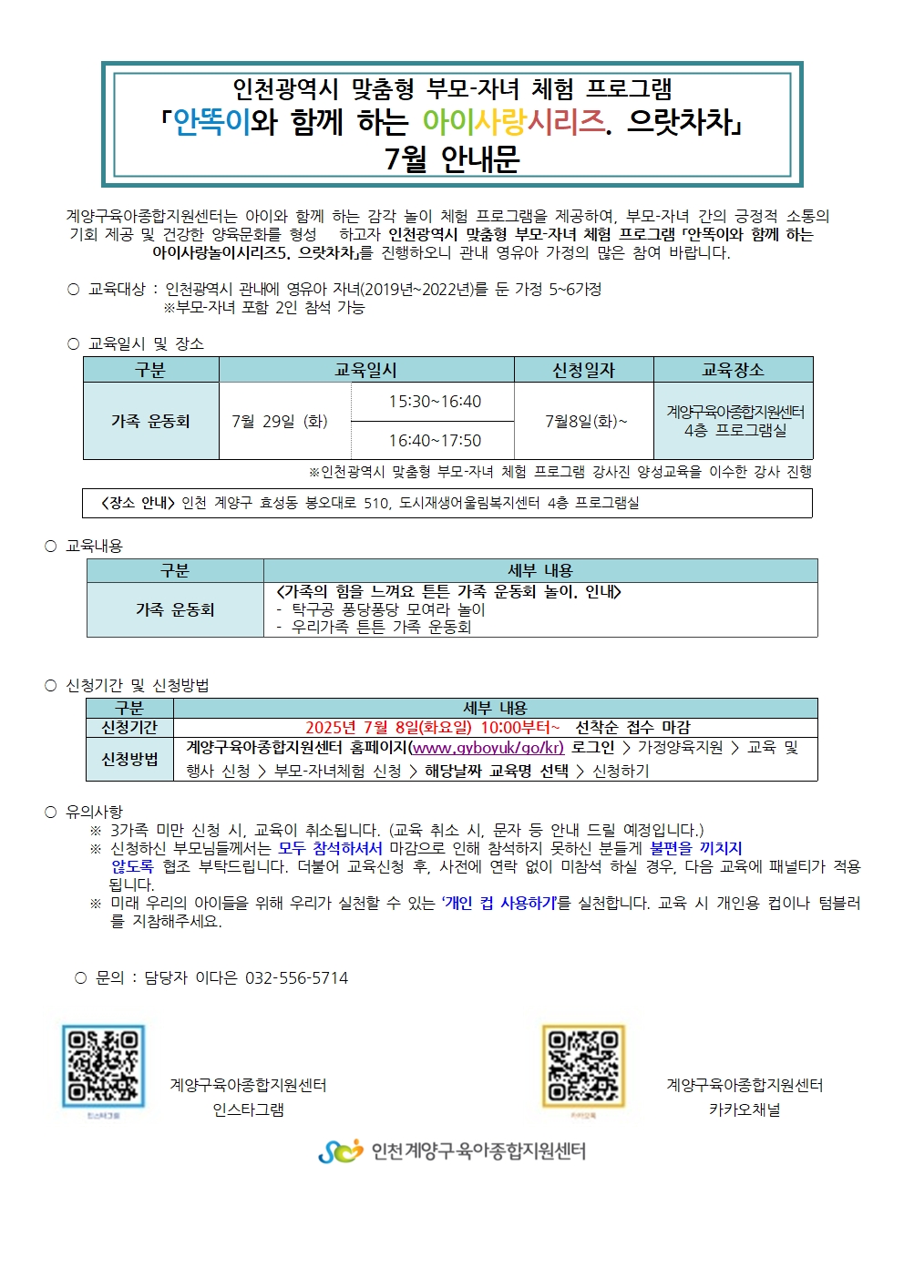 | 기타사항 | **참여 안내 및 유의사항** ※3가족 미만 신청 시 교육이 취소될 수 있습니다. (취소 시 전화 혹은 문자로 안내드리겠습니다.) ※신청하신 부모님들께서는 모두 참석해 주시기 바랍니다. 3회이상 미참여시 다음 체험 및 교육신청에 제한됩니다. ※부득이한 사정으로 취소 시, 반드시 전화로 연락해 주세요 (032-556-5714). ※해당 연령대에 맞지 않는 신청은 취소될 수 있습니다. 양해 부탁드립니다. ※체험 당일 참석 여부 확인 전화를 받지 않으실 경우, 대기자로 순번이 넘어갈 수 있습니다. ※동일 강의에 대해서는 1회만 신청 가능하며, 중복 신청 시 취소됩니다. |