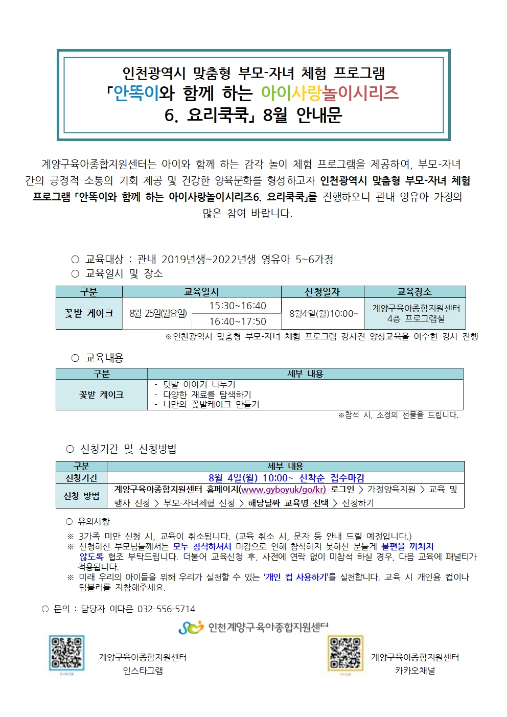 | 기타사항 | **참여 안내 및 유의사항** ※안전상의 이유로 부모-자녀 1:1로만 신청가능합니다. 양해부탁드립니다. ※활동 시 가공식품(젤리,빵 등)이 사용됩니다. 관련 알레르기나 기호가 있으신 가정은 신청시 반드시 참고하여주세요. ※당일 취소 및 무단 불참(연락 없이 불참)이 3회 이상 발생한 경우, 다음 달 체험 프로그램 신청이 제한됩니다. 프로그램 운영에 차질이 없도록, 일정 확인 후 신중하게 신청해 주세요. ※3가족 미만 신청 시 교육이 취소될 수 있습니다. (취소 시 전화 혹은 문자로 안내드리겠습니다.) ※부득이한 사정으로 취소 시, 반드시 전화로 연락해 주세요 (032-556-5714). ※해당 연령대에 맞지 않는 신청은 취소될 수 있습니다. 양해 부탁드립니다. ※체험 당일 참석 여부 확인 전화를 받지 않으실 경우, 대기자로 순번이 넘어갈 수 있습니다. ※동일 강의에 대해서는 1회만 신청 가능하며, 중복 신청 시 취소됩니다. |
