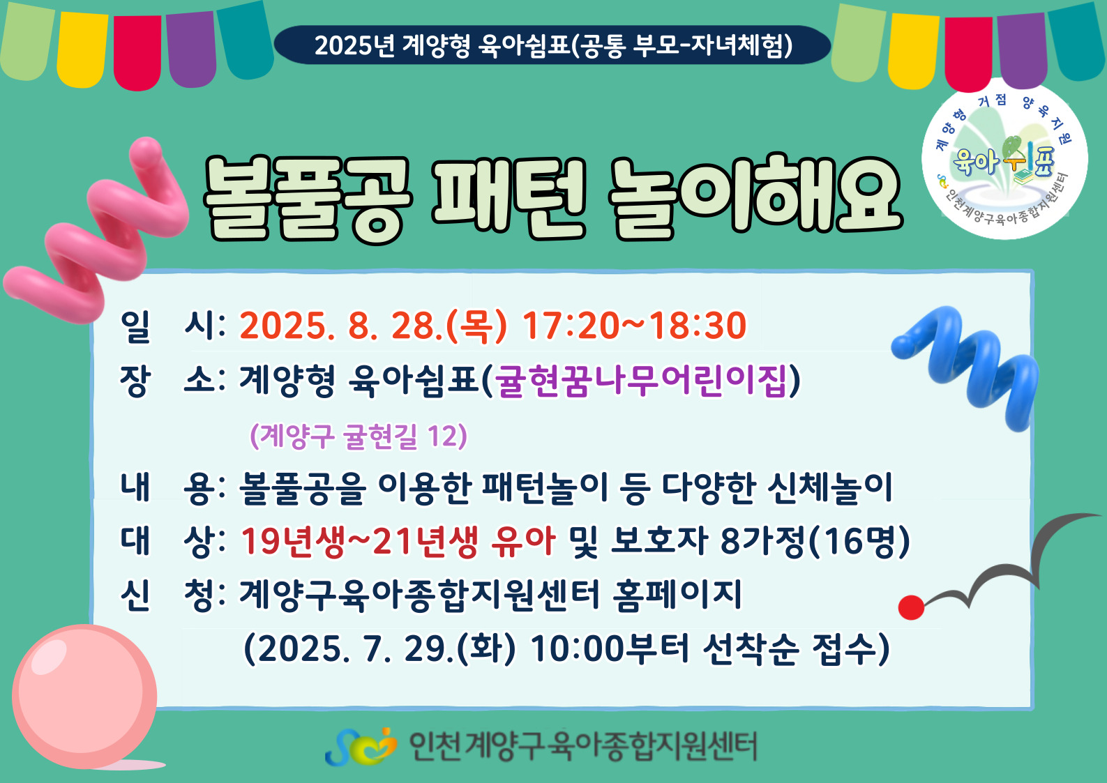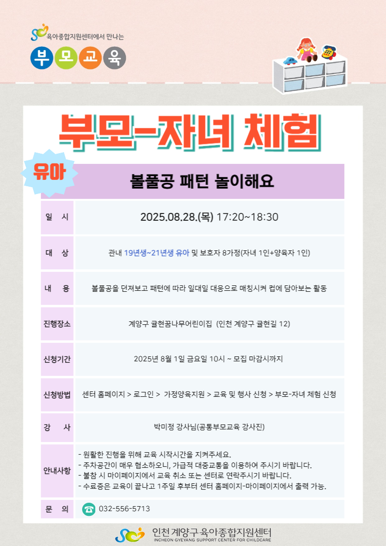 | 기타사항 | 계양형 육아쉼표 교육으로 지역의 거점어린이집에서 진행됩니다. 교육 장소는 귤현꿈나무어린이집 입니다 (계양구 귤현길 12) |