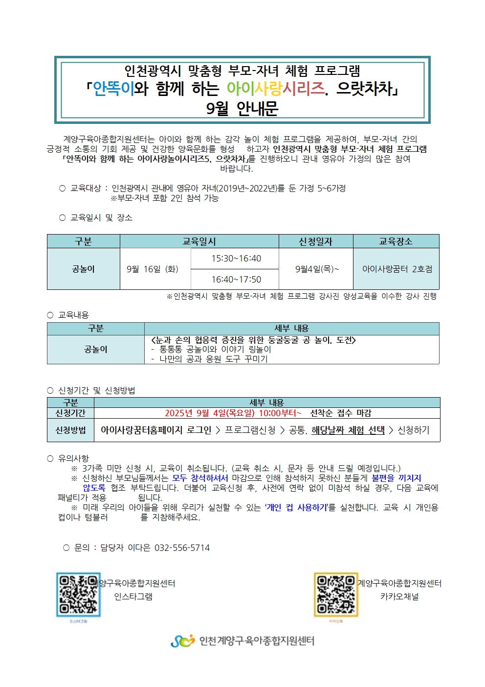 | 기타사항 | **참여 안내 및 유의사항** ※아이사랑꿈터 홈페이지에서만 신청이 가능합니다. ※3가족 미만 신청 시 교육이 취소될 수 있습니다. (취소 시 전화 혹은 문자로 안내드리겠습니다.) ※신청하신 부모님들께서는 모두 참석해 주시기 바랍니다. 당일취소 및 무단불참시 9월 체험 및 교육신청에 제한됩니다. ※부득이한 사정으로 취소 시, 반드시 전화로 연락해 주세요 (032-556-5714). ※해당 연령대에 맞지 않는 신청은 취소될 수 있습니다. 양해 부탁드립니다. ※체험 당일 참석 여부 확인 전화를 받지 않으실 경우, 대기자로 순번이 넘어갈 수 있습니다. ※동일 강의에 대해서는 1회만 신청 가능하며, 중복 신청 시 취소됩니다. |