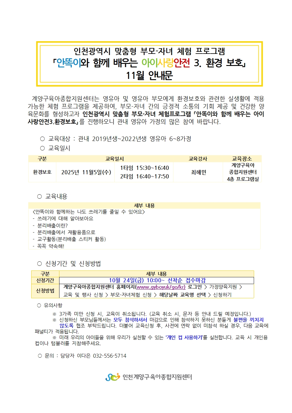 | 기타사항 | **참여 안내 및 유의사항** ※3가족 미만 신청 시 교육이 취소될 수 있습니다. (취소 시 전화 혹은 문자로 안내드리겠습니다.) ※신청하신 부모님들께서는 모두 참석해 주시기 바랍니다. 당일취소 및 무단불참시 11월 체험 및 교육신청에 제한됩니다. ※부득이한 사정으로 취소 시, 반드시 전화로 연락해 주세요 (032-556-5714). ※해당 연령대에 맞지 않는 신청은 취소될 수 있습니다. 양해 부탁드립니다. ※체험 당일 참석 여부 확인 전화를 받지 않으실 경우, 대기자로 순번이 넘어갈 수 있습니다. ※동일 강의에 대해서는 1회만 신청 가능하며, 중복 신청 시 취소됩니다. |