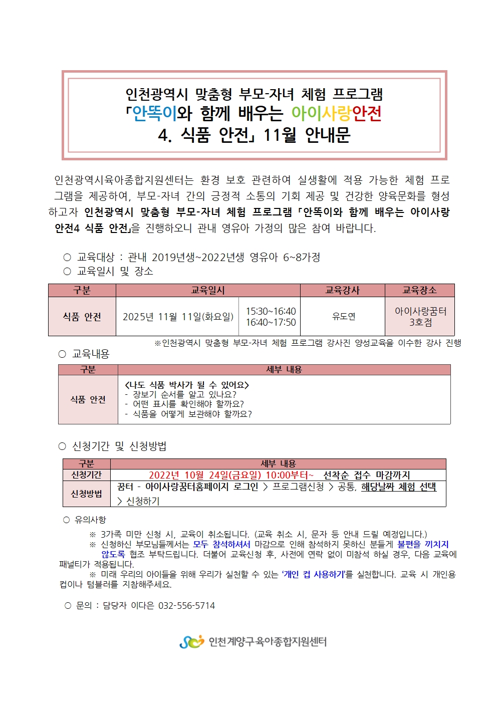 | 기타사항 | **참여 안내 및 유의사항** ※꿈터 홈페이지에서만 신청가능합니다. ※3가족 미만 신청 시 교육이 취소될 수 있습니다. (취소 시 전화 혹은 문자로 안내드리겠습니다.) ※신청하신 부모님들께서는 모두 참석해 주시기 바랍니다. 당일취소 및 무단불참시 11월 체험 및 교육신청에 제한됩니다. ※부득이한 사정으로 취소 시, 반드시 전화로 연락해 주세요 (032-556-5714). ※해당 연령대에 맞지 않는 신청은 취소될 수 있습니다. 양해 부탁드립니다. ※체험 당일 참석 여부 확인 전화를 받지 않으실 경우, 대기자로 순번이 넘어갈 수 있습니다. ※동일 강의에 대해서는 1회만 신청 가능하며, 중복 신청 시 취소됩니다. |