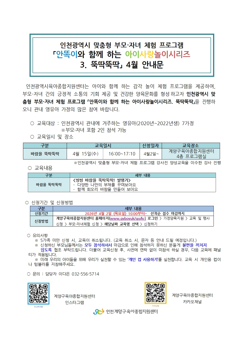 | 기타사항 | **참여 안내 및 유의사항** ※5가족 미만 신청 시 교육이 취소될 수 있습니다. (취소 시 전화 혹은 문자로 안내드리겠습니다.) ※신청하신 부모님들께서는 모두 참석해 주시기 바랍니다. 당일취소 및 무단불참시 체험 및 교육신청에 제한됩니다. ※부득이한 사정으로 취소 시, 반드시 전화로 연락해 주세요 (032-556-5714). ※해당 연령대에 맞지 않는 신청은 취소될 수 있습니다. 양해 부탁드립니다. ※체험 당일 참석 여부 확인 전화를 받지 않으실 경우, 대기자로 순번이 넘어갈 수 있습니다. ※동일 강의에 대해서는 1회만 신청 가능하며, 중복 신청 시 취소됩니다. |