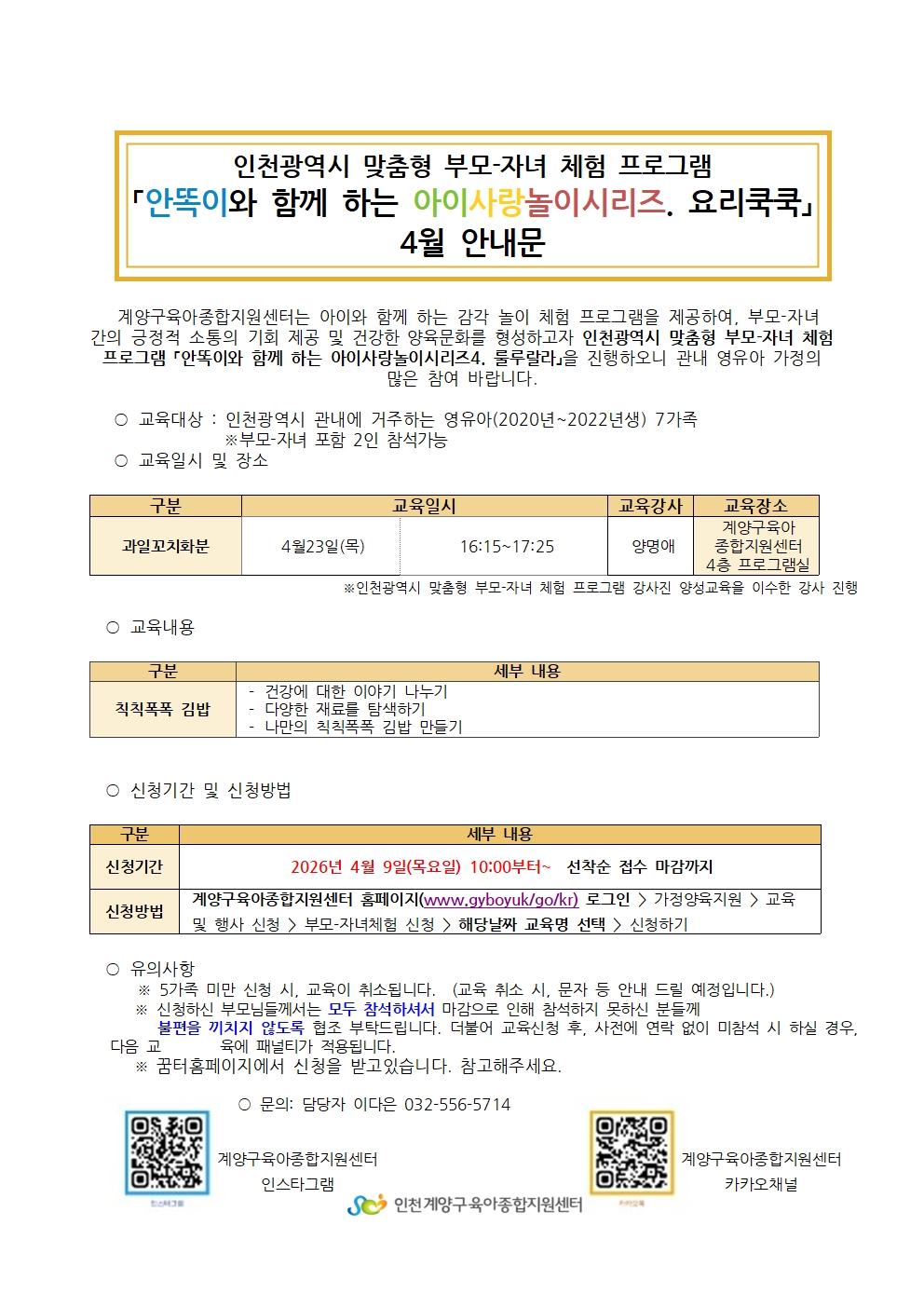 | 기타사항 | **참여 안내 및 유의사항** ※5가족 미만 신청 시 교육이 취소될 수 있습니다. (취소 시 전화 혹은 문자로 안내드리겠습니다.) ※신청하신 부모님들께서는 모두 참석해 주시기 바랍니다. 당일취소 및 무단불참시 체험 및 교육신청에 제한됩니다. ※부득이한 사정으로 취소 시, 반드시 전화로 연락해 주세요 (032-556-5714). ※해당 연령대에 맞지 않는 신청은 취소될 수 있습니다. 양해 부탁드립니다. ※체험 당일 참석 여부 확인 전화를 받지 않으실 경우, 대기자로 순번이 넘어갈 수 있습니다. ※동일 강의에 대해서는 1회만 신청 가능하며, 중복 신청 시 취소됩니다. |