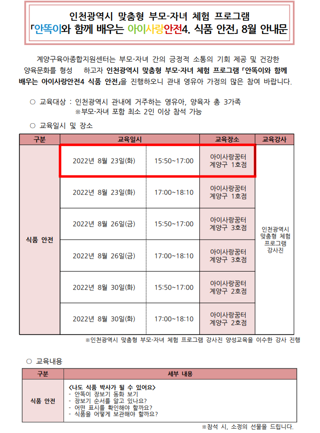 인천광역시 맞춤형 부모-자녀 체험 안똑이와 함께 배우는 아이사랑안전4. 식품안전