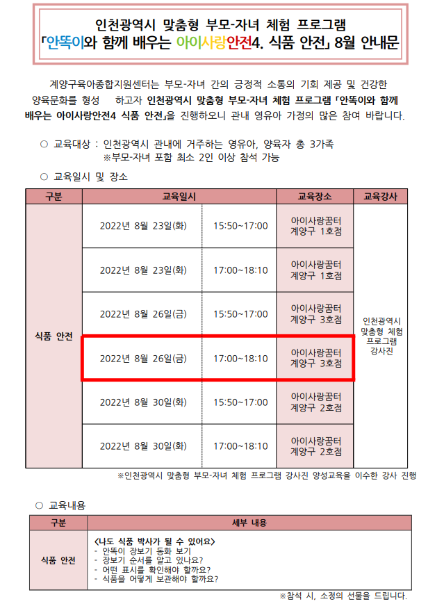인천광역시 맞춤형 부모-자녀 체험 안똑이와 함께 배우는 아이사랑안전4. 식품안전