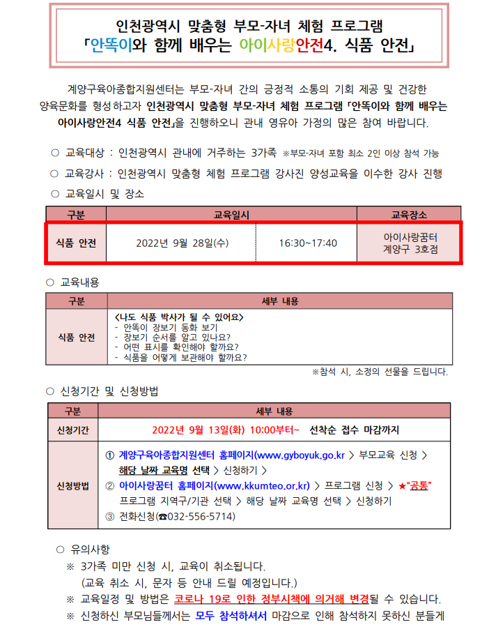 --> 9/28(수) 오후 4시 30분~5시 40분 / 아이사랑꿈터 계양구 3호점(계양구 효서로 324 작전동풍림아이원아파트 104동 101호)