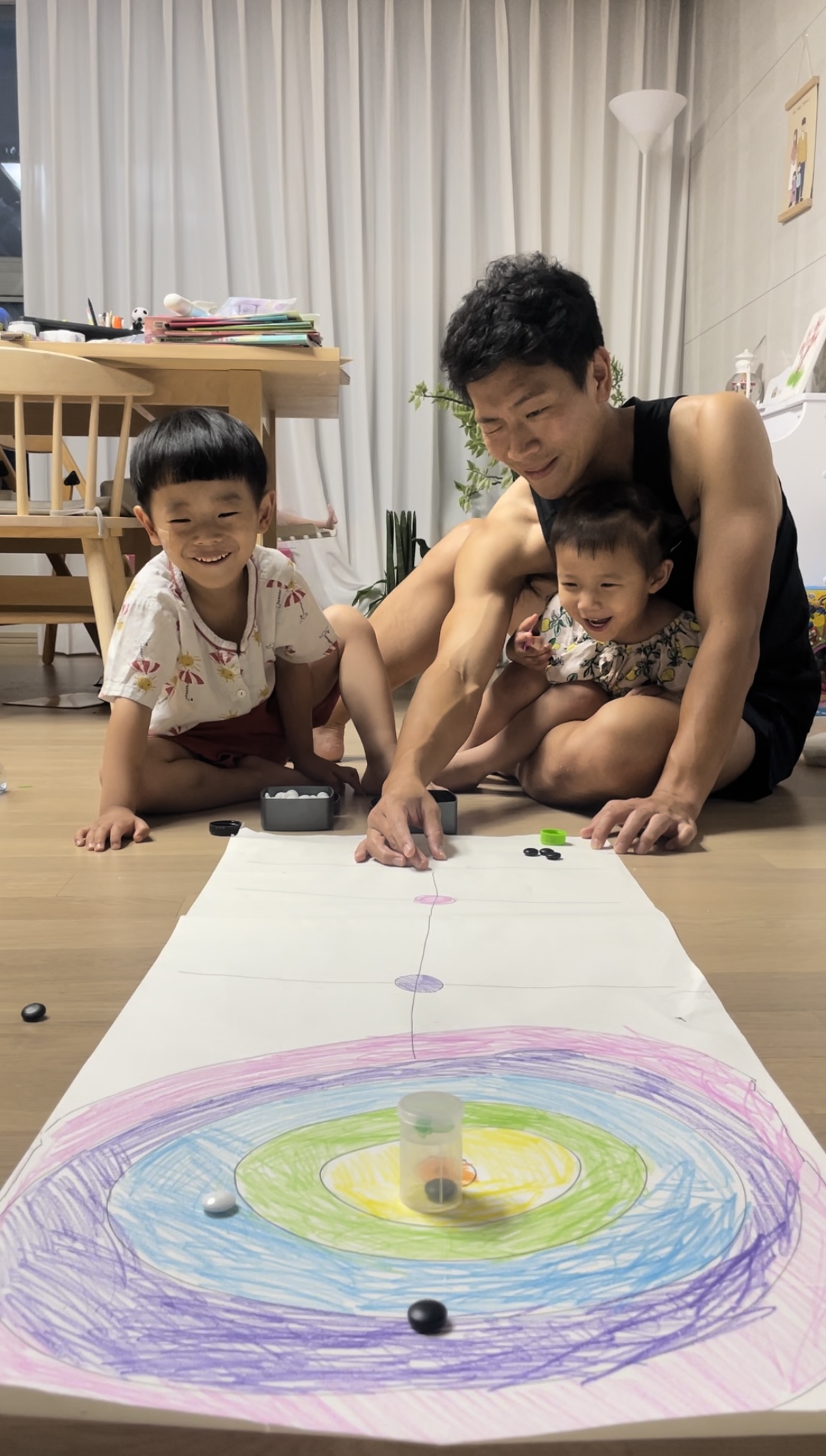 놀이만세 책자를 보던 중 '컬링놀이'를 보자마자 바로 진행했습니다. 오늘 30분 정도 했는데 버리지 말고 매일 하자고 합니다. 뚜껑이 아닌 바둑알로 해봤는데 내일은 뚜껑으로 해보기로 약속했습니다.